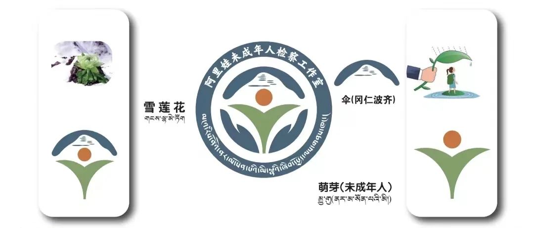 LOGO寓意:利用雪域高原特有的雪莲花和阿里地区具有代表性的神山冈仁波齐,融入“伞”的元素及萌芽;雪莲花生长在十分恶劣的自然环境中,具有顽强的生命力,所以总是能给人们带来希望。“伞”具有保护的象征寓意,萌芽代表着未成年人,初升的太阳蕴含着朝气蓬勃的青春,整体寓意着未成年人受到细心的保护,在阿里检察的保护下给予未成年人更多的希望与安全感。