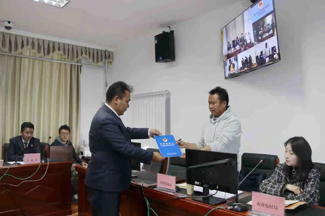 图为仲巴县检察院在公开听证会现场向县自然资源局送达检察建议书。