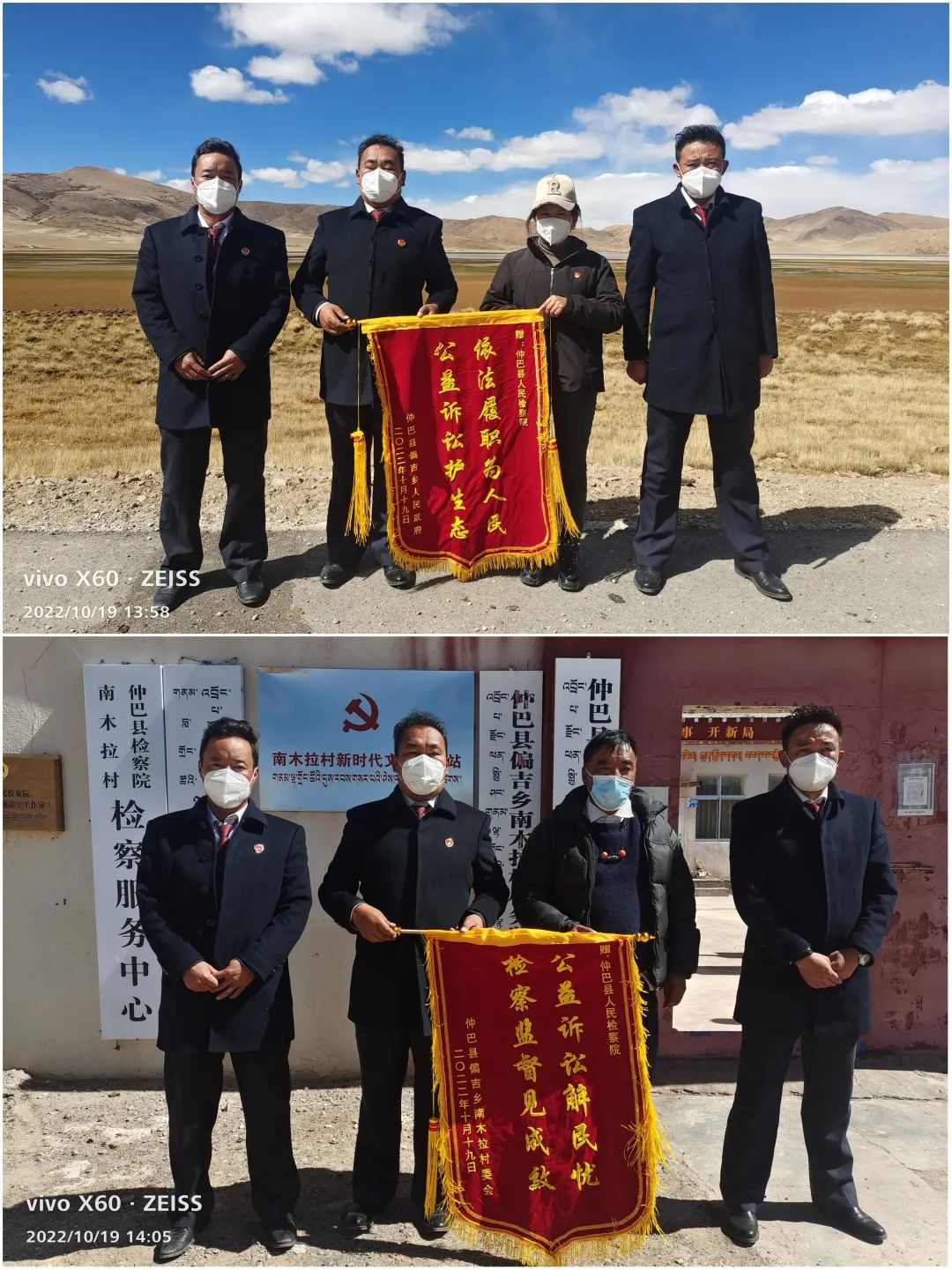 图为偏吉乡人民政府、南木拉村委会将印有“依法履职为人民 公益诉讼护生态”“公益诉讼解民忧 检察监督见成效”的锦旗送到检察官手中。
