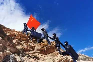阿里地区马攸桥边境检查站民警巡逻在海拔5360米的陡峭山路上