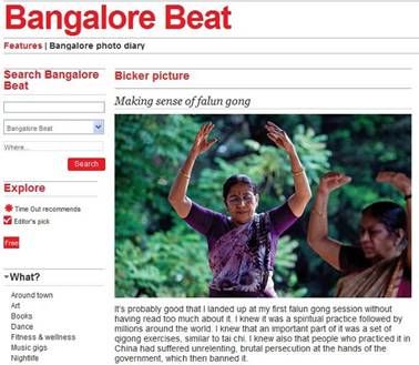 Time Out Bangalore是印度南部城市班加罗尔的一份娱乐生活杂志。2011年8月5日,Ajay Krishnan在该杂志发表文章,称其无意中习练了法轮功,但法轮功的动作令其很不舒服,通过在网上查阅法轮功资料,Ajay表示对法轮功的教义不予赞同,对法轮功充满疑惑,认为法轮功不好消化,难以理解。
