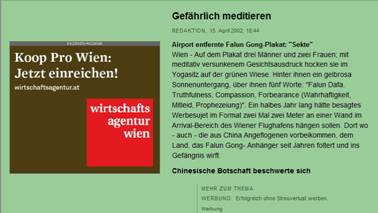 2002年4月15日,奥地利标准报网站发表了一则关于法轮功的新闻:法轮功组织连续半年在维也纳飞机到达区域场悬挂2米乘2米大小的广告画。之后,飞机场清除了法轮功广告。