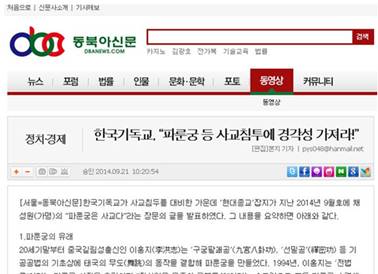 韩国《现代宗教》杂志2014年9月号上发表了蔡成远(化名)撰写的题为《法轮功是邪教》的长篇文章,通过法轮功在韩国致人死亡的多个悲惨案例,在揭露法轮功罪行本质的同时,指出韩国民众抵制法轮功的声势日益高涨,并警示韩国基督教“高度警惕法轮功邪教的渗透”。韩国东北亚新闻网站对其进行编辑转载,于2014年9月21日刊载题为《韩国基督教高度警惕法轮功等邪教的渗透》一文。