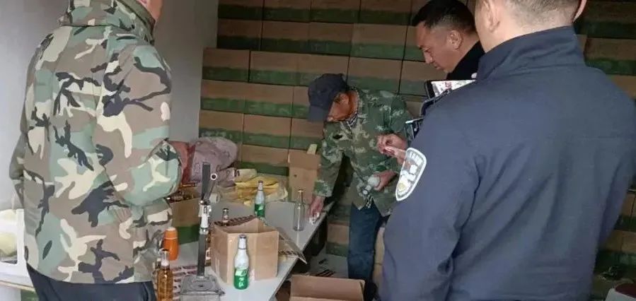 同时,在该加工厂房旁边的存储仓库内,执法人员发现有1名工人正在休息,并现场查获假冒“百威纯生啤酒”461件(每件净含量355ML*24)、压盖机4台、“百威纯生啤酒”正面及反面标签纸张1件。